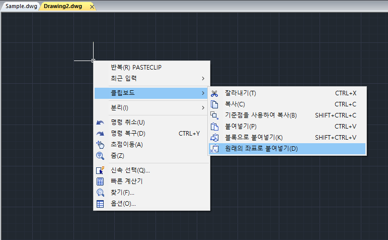 2. 붙여넣기 할 도면으로 이동 후 빈 공간에 오른쪽 마우스를 클릭하여 창이 표시되면