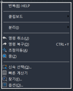 본 게시글에서는 Shift 키를 누른 상태에서 마우스를 우클릭 했을 때 표시되는 객체 스냅 커서 메뉴를 예시로 들겠습니다.