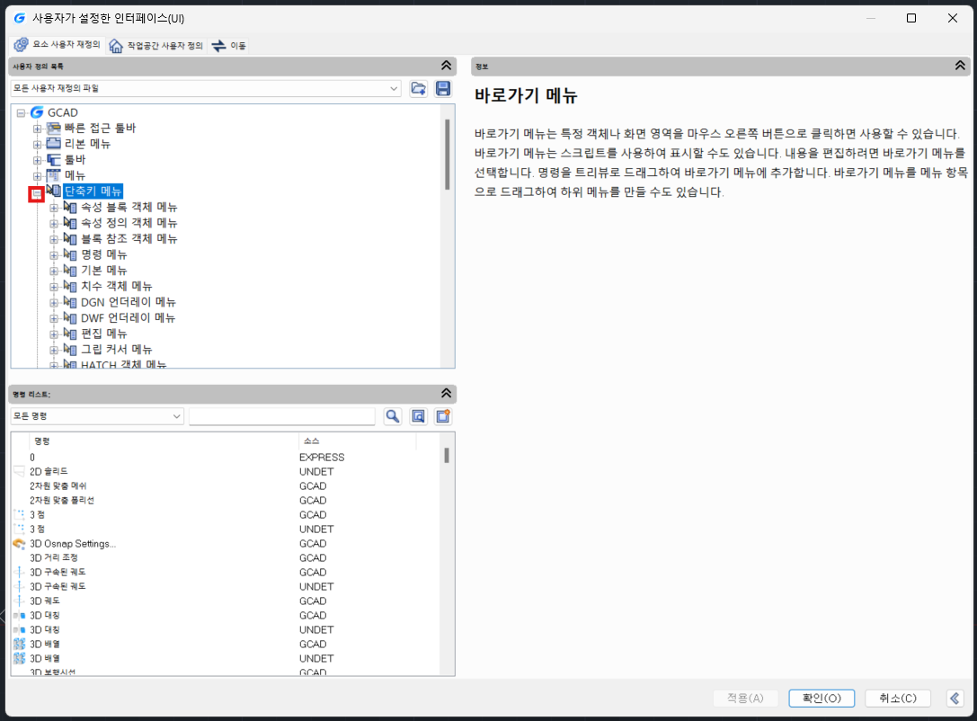 이러한 방법으로 풀다운 메뉴 또는 바로가기 메뉴에 원하는 단축키를 추가하거나 수정, 제거 하실 수 있습니다.