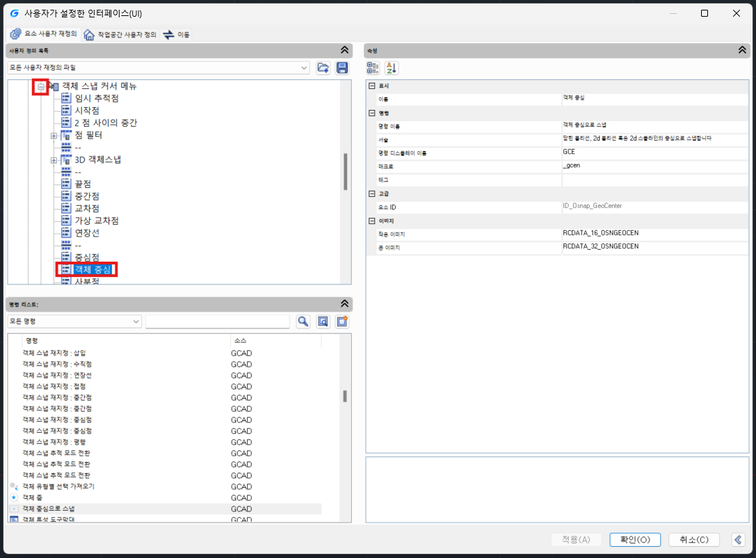 3. 객체 스냅 커서를 메뉴를 찾아 [+] 기호를 클릭하여 확장한 후 객체 중심 항목을 선택합니다.