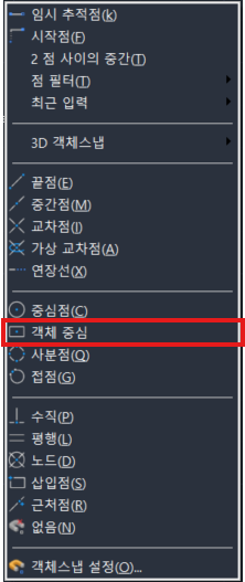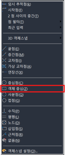 5. 객체 스냅 커서 메뉴를 표시해보면 객체 중심에 (Z)가 추가되었고, 이제 키보드 Z 키로 실행할 수 있습니다.