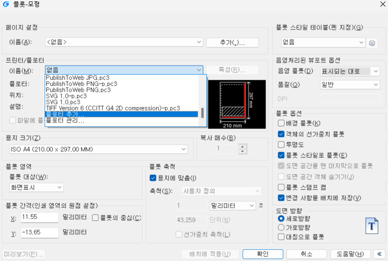 2. 플롯 대화상자가 나오면 프린터/플로터의 이름 항목에서 [플로터 추가...]를 찾아 클릭합니다.