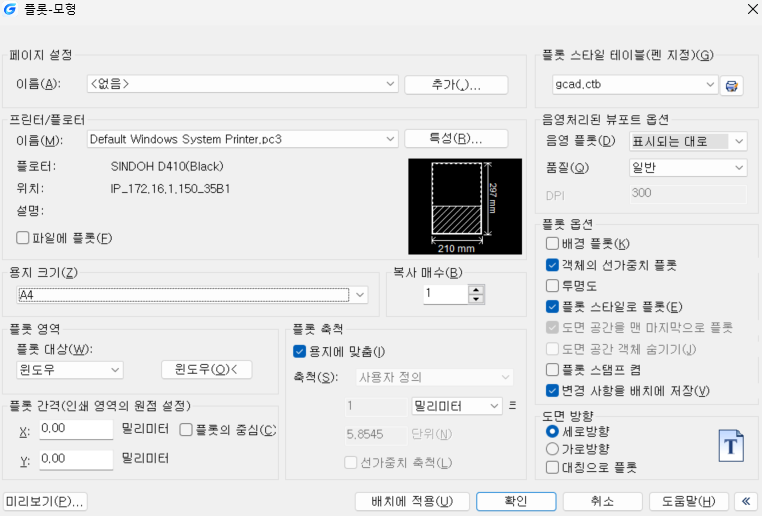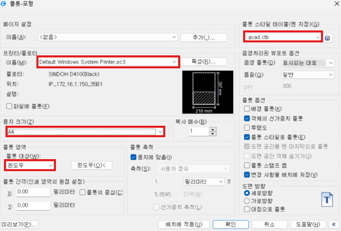 2. 아래와 같이 프린터를 선택한 후 용지 크기, 플롯 영역, 플롯 스타일을 지정해 줍니다.