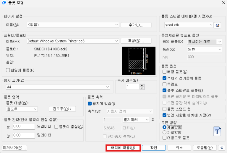 플롯 설정을 한 다음 적용하지 않고 인쇄를 진행하면 플롯 설정값이 저장되지 않습니다.